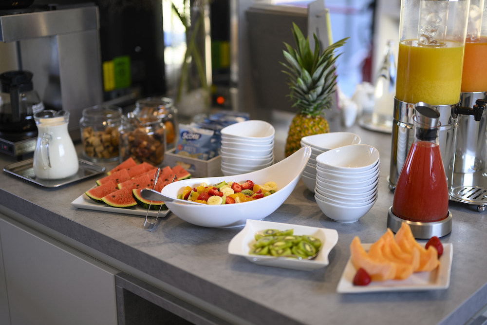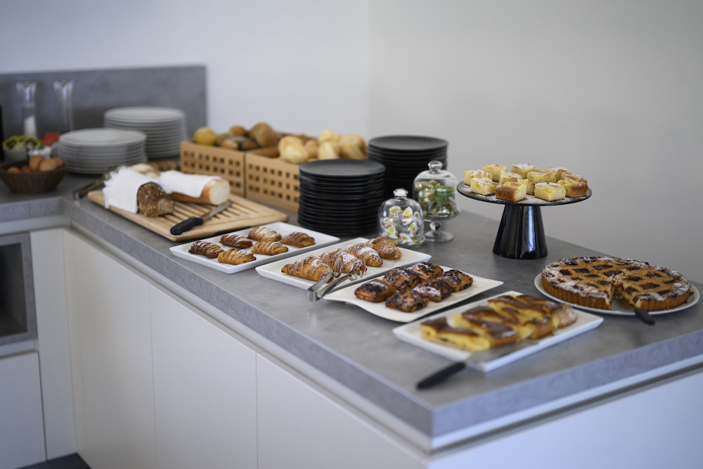 Offre un ricco buffet dolce e salato con uova sode e strapazzate, pancetta, salsiccia, affettati, formaggi, una vasta scelta di pane, muesli, cereali, marmellate e miele, yogurt, succhi di frutta, brioches, croissant, torte, biscotti, frutta fresca e sciroppata.