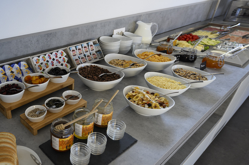 Our sweet and salat buffet offers eggs, bacon, sausages, ham, cheese, a wide choice of bread, cereals, muesli, marmalade, jam and honey, yogurt, fruit juice, brioches, croissant, cake, fresh fruit and fruit in syrup.